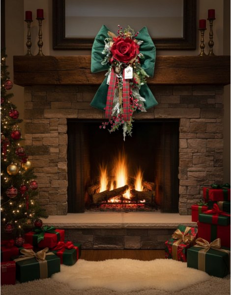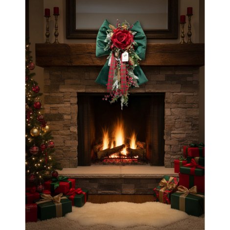 Fiori di Lena - Doppio Fiocco in Velluto imbottito con rosa vellutata e decoro natalizio 70 cm