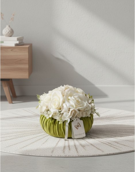 Fiori di Lena - Pouff in velluto verde acido e rose bianche - diametro 18